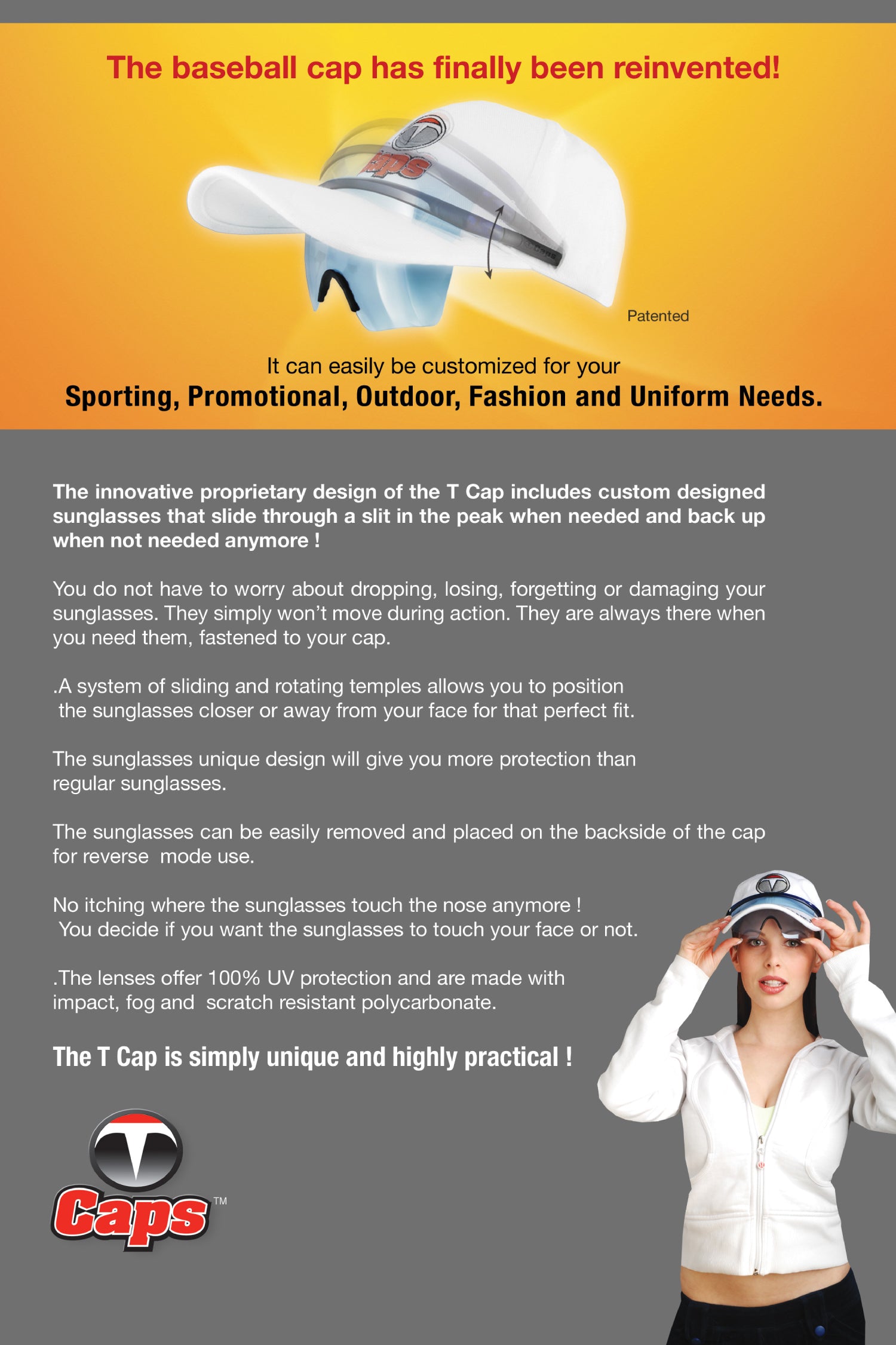 At TCAPS INTERNATIONAL ™, The innovative proprietary design of the TCaps includes custom designed sunglasses that slide through a slit in the peak when needed and back up when not needed anymore!